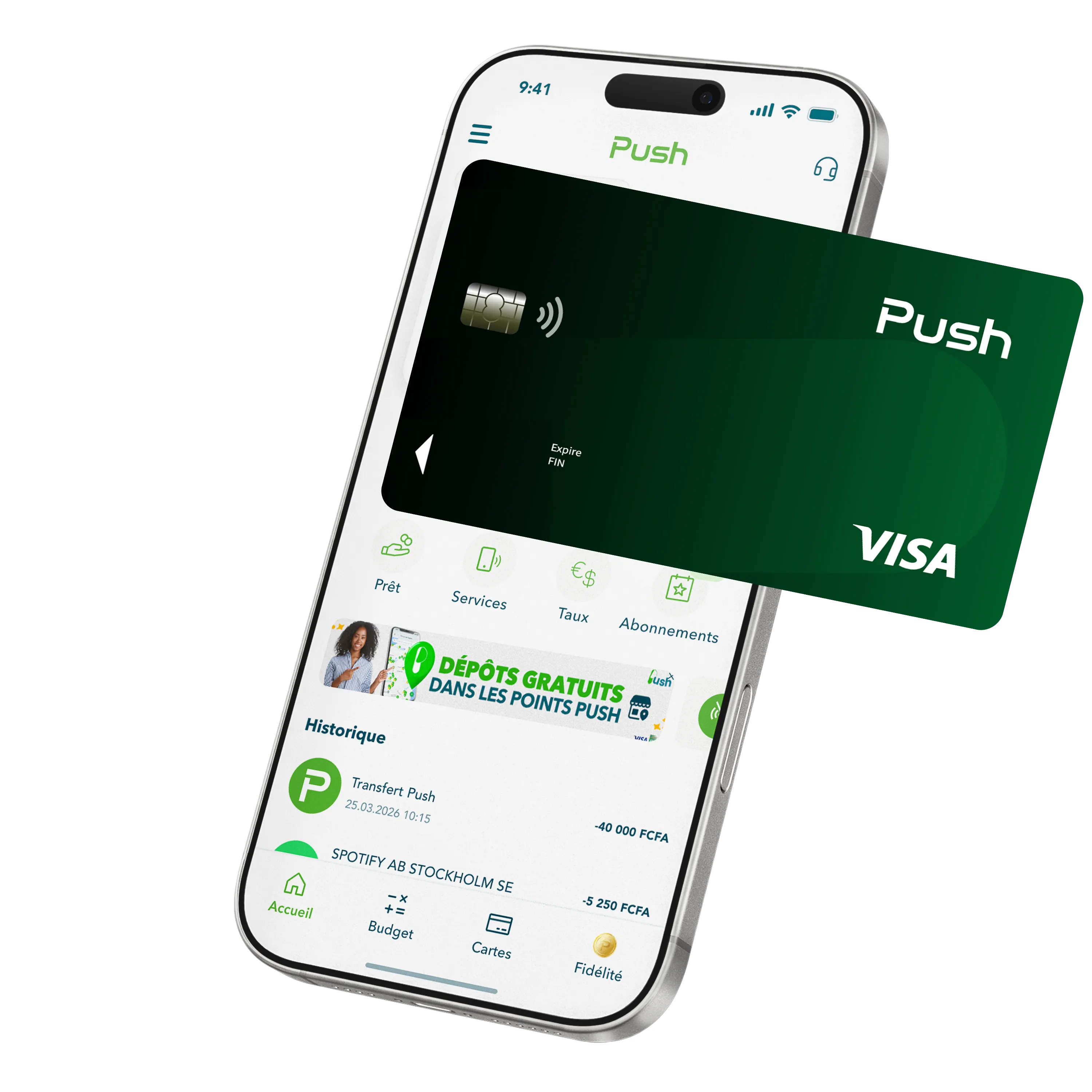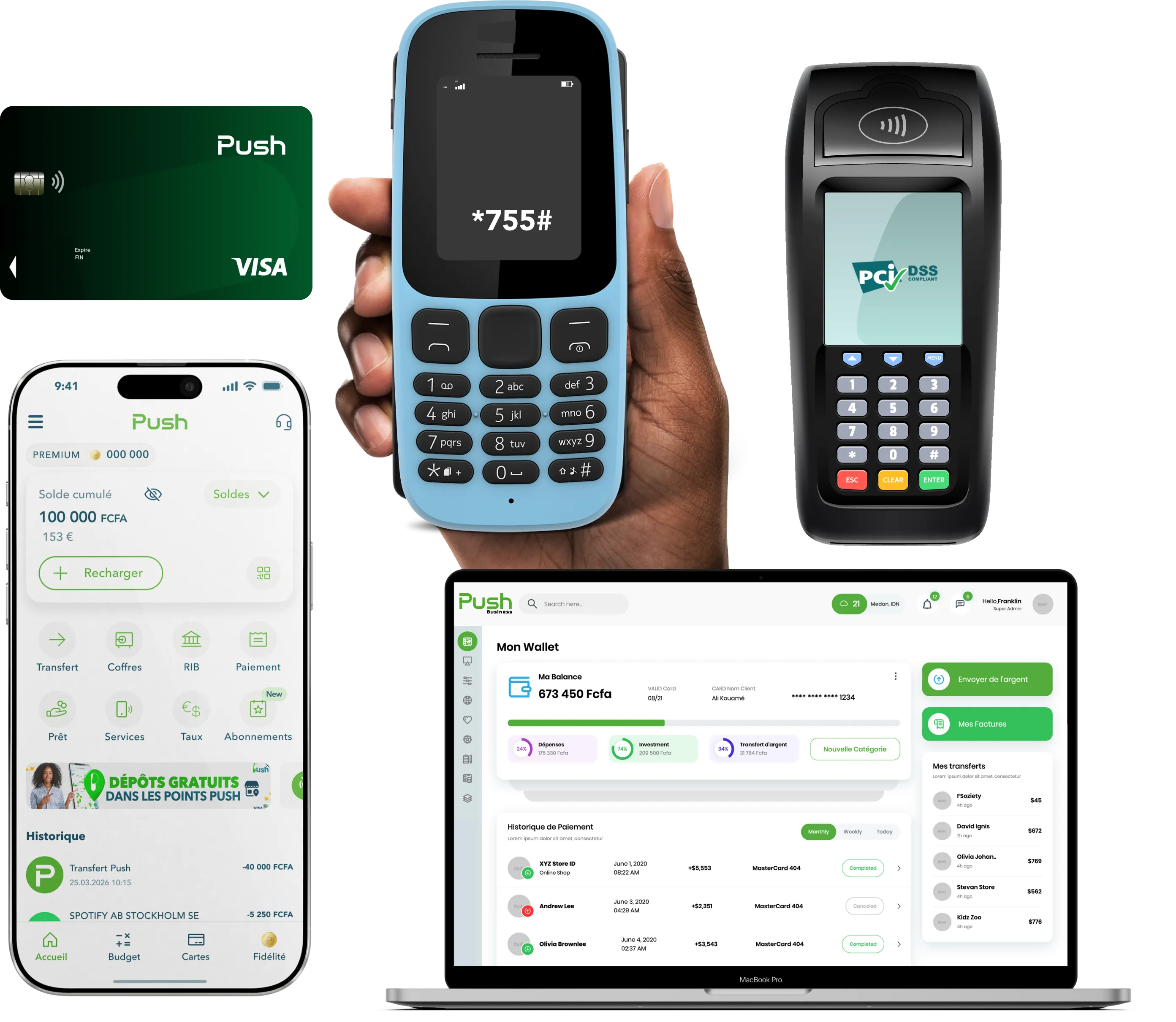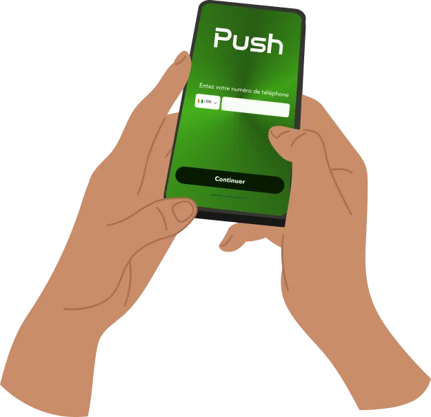Via notre application ou en composant le code USSD *755# , ou même en vous rendant dans le point Push le plus proche de chez vous, bénéficiez 24/7, avec ou sans internet, des services de Push . :